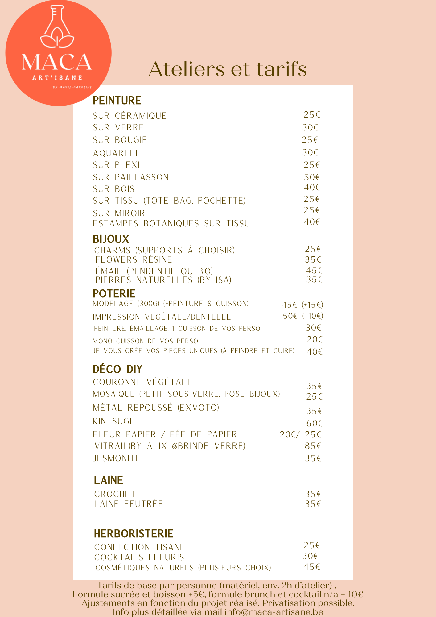 | ATELIERS | Tous les tarifs sont HTVA (possibilité de facture en y ajoutant la TVA 21%) |