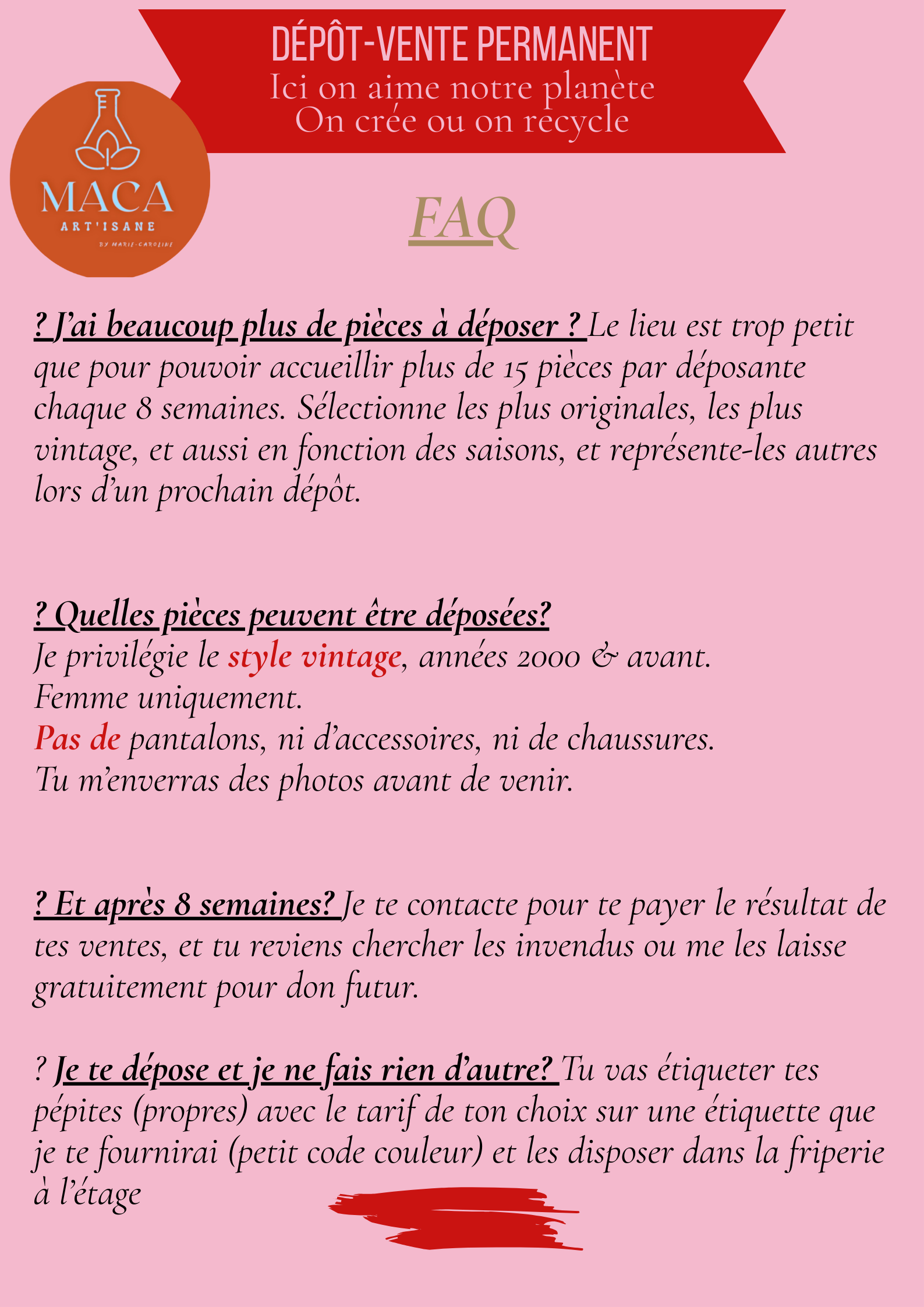 MACA Art’isane s’agrandit et ouvre sa friperie vintage, un espace doux et rempli de trésors soigneusement chinés ou déposés par les copines au grenier. Ce rêve complète mon petit lieu pensé pour flâner, fouiller, s’inspirer et repartir avec un coup de cœur, en lui donnant une seconde vie. Bienvenue dans notre univers cosy et intimiste. Vêtements Femme (pas d'accessoires)